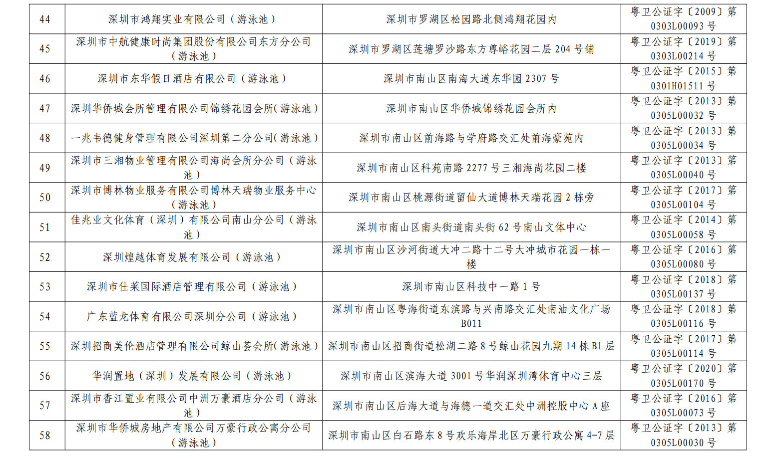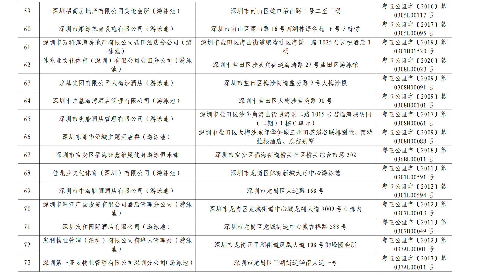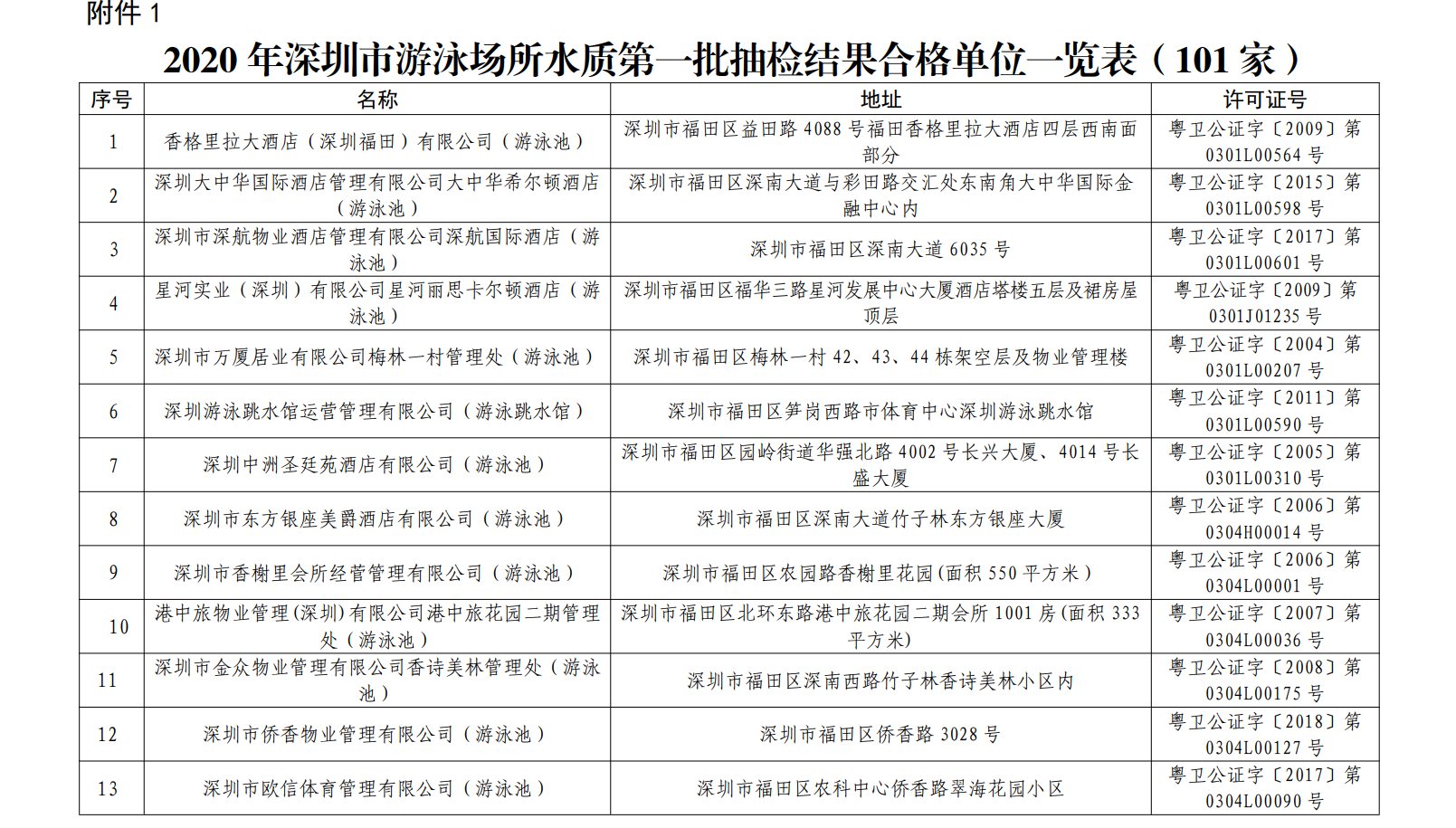2020年深圳市游泳場(chǎng)所水質(zhì)第一批抽檢結(jié)果合格單位一覽表(101家)