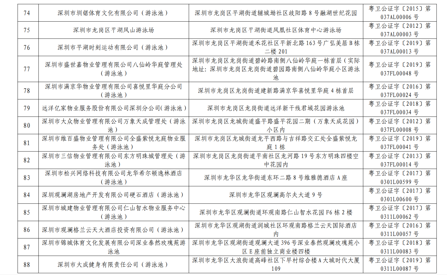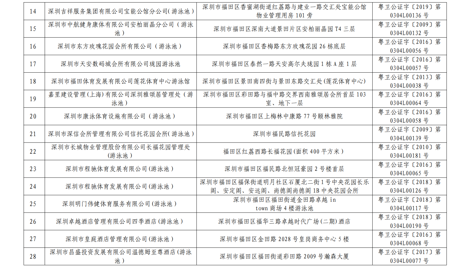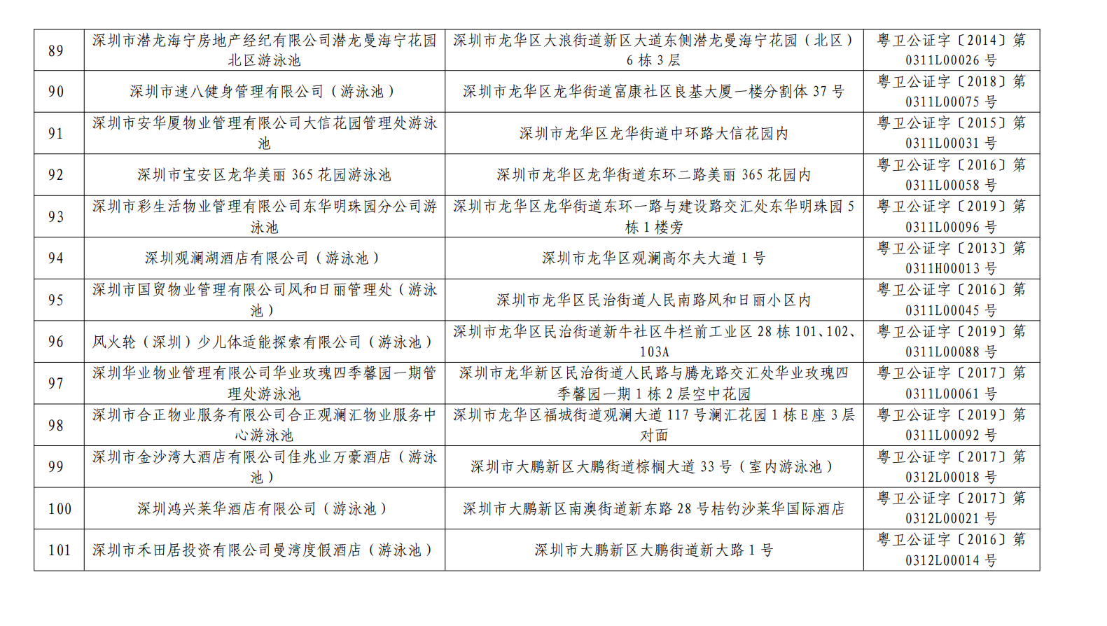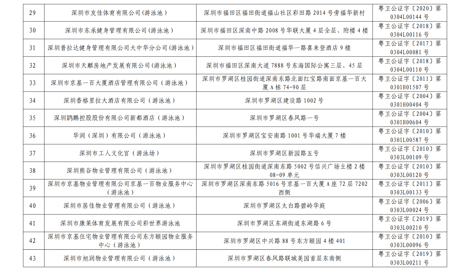 2020年深圳市游泳場(chǎng)所水質(zhì)第一批抽檢結(jié)果合格單位一覽表(101家)