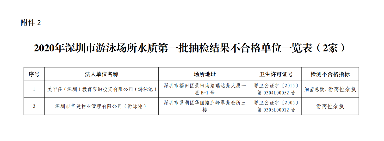 2020年深圳市游泳場(chǎng)所水質(zhì)第一批抽檢結(jié)果不合格單位一覽表(2家)
