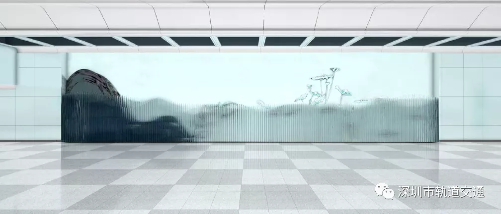 該站的文化藝術墻采用鋼化玻璃和不銹鋼噴漆,通過材質(zhì)的特性,呈現(xiàn)出自然變化的形態(tài),不同環(huán)境下不同的形態(tài)美。