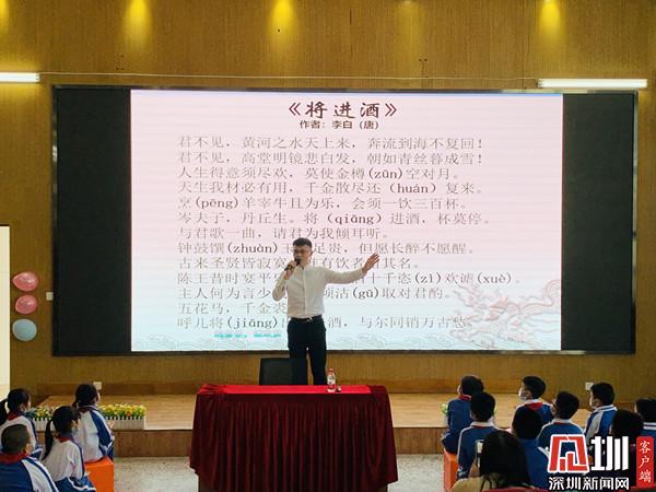 深圳新聞網(wǎng)訊(深圳新聞網(wǎng)記者 彭桂紅 通訊員 梁文雅)為進(jìn)一步弘揚(yáng)中華優(yōu)秀傳統(tǒng)文化,近日,深圳市錦田小學(xué)特邀青年文化學(xué)者、深圳市百姓學(xué)習(xí)之星、深圳市公益閱讀推廣人、深圳市首屆家園文化文學(xué)會(huì)會(huì)長(zhǎng)晉玉東為廣大師生開(kāi)展了一場(chǎng)別開(kāi)生面的“中國(guó)古典詩(shī)詞朗誦藝術(shù)鑒賞——兼談如何朗誦好一首詩(shī)”公益文化講座。羅湖區(qū)錦田小學(xué)德弘校區(qū)副校長(zhǎng)劉向陽(yáng)、羅湖區(qū)錦田小學(xué)德弘校區(qū)主任張俊暉、羅湖區(qū)未來(lái)學(xué)校主任謝淑紅、德弘二年級(jí)家委代表以及語(yǔ)文科組老師,一同參加?;顒?dòng)由班主任梁文雅和學(xué)生劉沛東、張家琪共同主持,近200名學(xué)生參加了講座活動(dòng)。整場(chǎng)講座師生熱情高漲,主講嘉賓深入淺出、娓娓道來(lái),參與學(xué)生思維活躍、表現(xiàn)積極,帶動(dòng)校園形成了學(xué)習(xí)詩(shī)詞文化的良好氛圍。