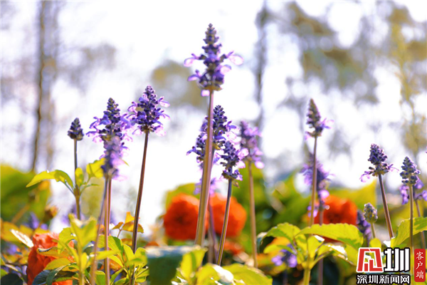 繁花似錦,花香滿(mǎn)園,而紫色的大花飛燕草在陽(yáng)光下最為亮眼。