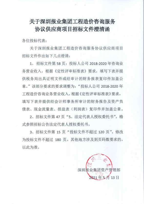 關(guān)于深圳報業(yè)集團工程造價資訊服務協(xié)議供應商項目招標文件澄清函