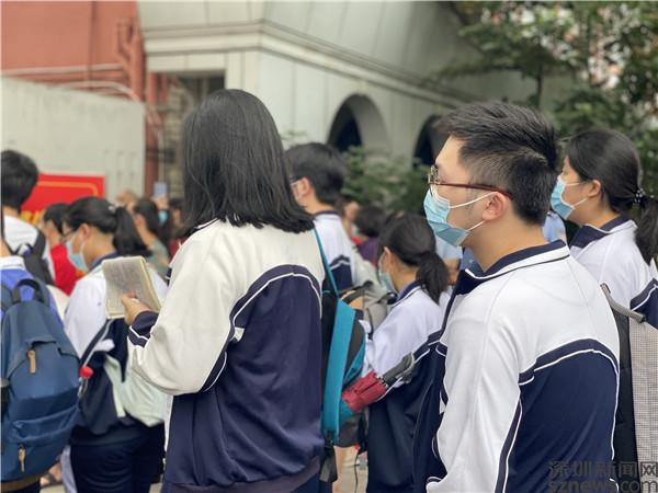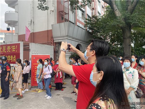 當(dāng)天上午7:50,記者來(lái)到羅湖區(qū)翠園中學(xué)和羅湖外語(yǔ)學(xué)校門(mén)口,只見(jiàn)考生們已陸續(xù)排隊(duì)領(lǐng)取準(zhǔn)考證,有序進(jìn)入考場(chǎng)。許多穿著“紅旗袍”戴著“紅口罩”的家長(zhǎng)們?cè)诩娂姸诤⒆觽兒?,已在校門(mén)口等候。