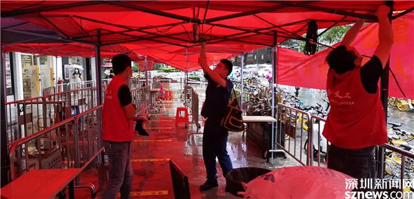6月22日早上,黃貝街道工作人員在風(fēng)雨中搭建核酸檢測(cè)點(diǎn)帳篷。