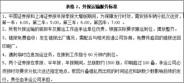 深圳報(bào)業(yè)集團(tuán)印務(wù)有限公司現(xiàn)承印外報(bào)主要有上海證券報(bào)、中國(guó)證券報(bào)、羊城晚報(bào)等重要報(bào)刊,根據(jù)各報(bào)刊的具體要求,安全、準(zhǔn)時(shí)、保質(zhì)、保量地運(yùn)送每天生產(chǎn)發(fā)行數(shù)量的各報(bào)刊到指定地點(diǎn)或客戶手中,具體運(yùn)輸發(fā)行內(nèi)容和標(biāo)準(zhǔn)詳見下面表格。