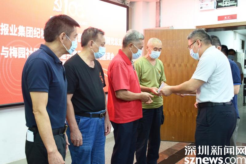 黨課結(jié)束后,陳鵬等代表深圳報(bào)業(yè)集團(tuán)一行對(duì)社區(qū)老黨員進(jìn)行慰問(wèn),并向老黨員代表送上慰問(wèn)金和禮包,隨后,陳鵬向梅園社區(qū)“光榮在黨50年”老黨員們頒發(fā)紀(jì)念章,“你們辛苦了,我們要向你們學(xué)習(xí),希望你們注意身體,繼續(xù)為社區(qū)做貢獻(xiàn)?!标慁i捧起紀(jì)念章,為老黨員們戴上,并對(duì)老黨員們送上關(guān)心和祝福。