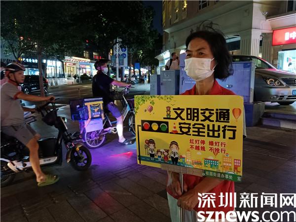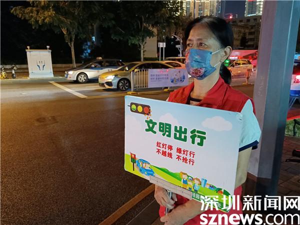 另一位堅(jiān)守在國慶假期里的義工是宣仲英,今年62歲。她一站兩個(gè)小時(shí),始終是精神抖擻,毫不松懈??吹接腥嗽噲D闖紅燈,她及時(shí)制止。看到有人不走斑馬線,她立刻提醒。她手持勸導(dǎo)文明出行的牌子,就像個(gè)交通警察,誰也別想在她的面前犯規(guī)。本來下午6點(diǎn)鐘,正是她給家人做晚餐,同家人一起吃飯的時(shí)間,但她聽說社區(qū)創(chuàng)文需要人,就跟家人商量,得到了家人的一致同意。她說,“我從內(nèi)地來到深圳,在老圍社區(qū)住了10年,感覺深圳做義工的氛圍特別濃厚,我也想做義工,為社會(huì)發(fā)揮余熱。”
