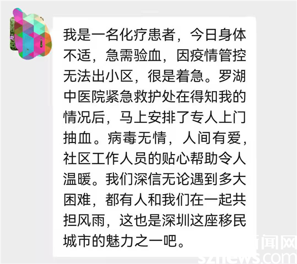 葉先生在護(hù)士為他抽血離開(kāi)之后,送上了真摯地感謝?!盁o(wú)論我們遇到多大的苦難總會(huì)有人和我們一起共擔(dān)風(fēng)雨,這就是深圳的魅力”,葉先生說(shuō)到。