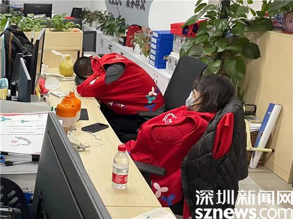 桂園街道疫情防控志愿者1月10日晚上工作到凌晨5點多做數(shù)據(jù)核查,在辦公室的椅子上睡著了。