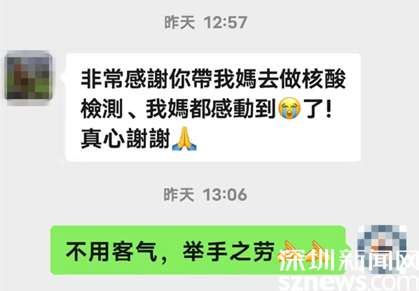 原來(lái),“紅馬甲”是老圍社區(qū)網(wǎng)格員劉珍蓮,她陪老人李曉萍來(lái)做核酸檢測(cè)。檢測(cè)順利結(jié)束,老人一激動(dòng),就抱著劉珍蓮哭了起來(lái)。事后,老人的兒子,身在香港的溫先生給劉珍蓮發(fā)來(lái)微信,說(shuō):“非常感謝你帶我媽去做核酸檢測(cè),我媽都感動(dòng)到哭了?!?/p>