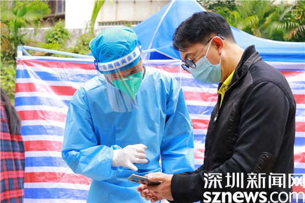 從2月17日開始,劉曉勇加入安保公司,被派到羅湖區(qū)東曉街道支援疫情防控工作,至今已有13天,13天里,他跟隨隊(duì)伍轉(zhuǎn)遍了東曉街道各個(gè)核酸檢測點(diǎn),從分流人群、維持秩序,到掃碼、引導(dǎo)居民操作、核酸檢測點(diǎn)布置、采樣結(jié)束收尾……對每個(gè)流程都了如指掌;13天里,他每天工作十幾個(gè)小時(shí),從早上九點(diǎn)到晚上十點(diǎn)、十一點(diǎn),只在中午輪班吃飯的時(shí)候有十幾分鐘休息時(shí)間。