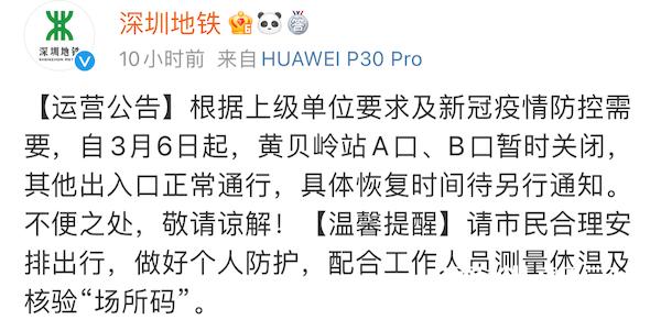 上午8時,深圳地鐵發(fā)布運營公告:3月6日起,黃貝嶺站A口、B口暫時關(guān)閉,其他出入口正常通行。