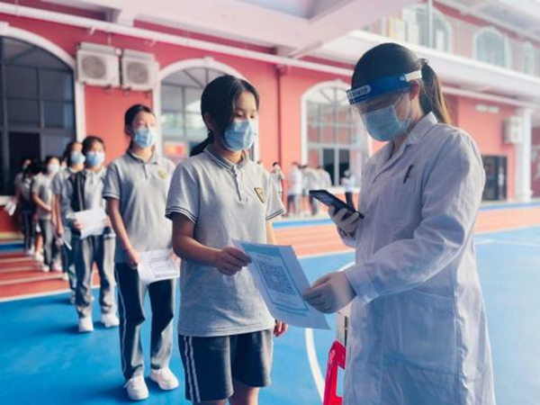 進入闊別已久的校園,興奮和激動的心情溢于言表,提前兩天入校的初三年級學生做出了表率:用餐隊伍一米距,透明隔斷搭建的用餐區(qū)明亮又溫馨;課間時間在班主任的帶領(lǐng)下,大家排隊測核酸,安靜、有序的隊伍讓“大白”對學生點贊。少年已歸,向陽而生;不忘初心,逐夢而行。這個夏天,老師帶領(lǐng)著學生們一邊防疫,一邊學習,合力同行,一起向未來!