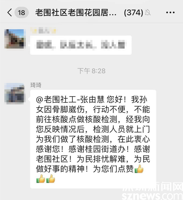 讀特客戶端·深圳新聞網(wǎng)2022年7月14日訊(記者 劉嘉敏 通訊員 楊紀(jì)歐)7月12日晚上8點多,羅湖區(qū)桂園街道老圍社區(qū)的居民琦琦在居民微信群里向社工張由慧說:“您好!我孫女因骨腳崴傷,行動不便,不能前往核酸點做核酸檢測,經(jīng)我向您反映情況后,檢測人員就上門為我們做了核酸檢測,在此衷心感謝您!感謝桂園街道辦!感謝老圍社區(qū)!為民排憂解難,為民做好事的精神!為你們點贊?!?/p>