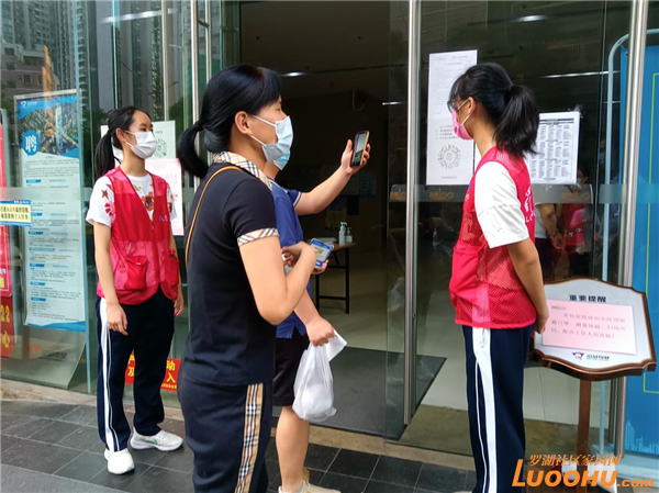 最先上陣的是一對(duì)父女兵:蔡玉堂和女兒蔡潤(rùn)怡,他們利用周末時(shí)間在老圍花園E棟單元門(mén)值守。這是兩棟高層住宅,兩個(gè)單元的人都從這個(gè)門(mén)進(jìn)出。只見(jiàn)父女倆一個(gè)指引進(jìn)入的居民掃場(chǎng)所碼,一個(gè)提示測(cè)體溫、驗(yàn)碼,倆人分工負(fù)責(zé),配合默契。他們都是老圍社區(qū)蔡屋圍村的居民,對(duì)自己的家園有著特殊的情感。今年12的蔡潤(rùn)怡更是在這里出生長(zhǎng)大,許多樓上樓下的鄰居都認(rèn)識(shí)她,看她做義工,都親熱地跟她打招呼,并主動(dòng)配合查驗(yàn)。雖然出入人員較多,但有了父女倆的值守,卡口井然有序。