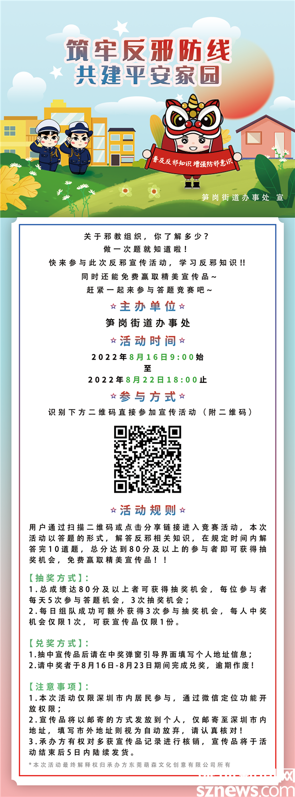 為做好反邪教警示教育宣傳工作,引導(dǎo)轄區(qū)內(nèi)居民進一步認清邪教危害,提高反邪教意識和能力,營造“無邪羅湖、和諧社區(qū)”濃厚氛圍,筍崗街道持續(xù)開展以“防范邪教侵害、守護平安家園”為主題的反邪教宣傳系列活動,實現(xiàn)反邪教宣傳全覆蓋。