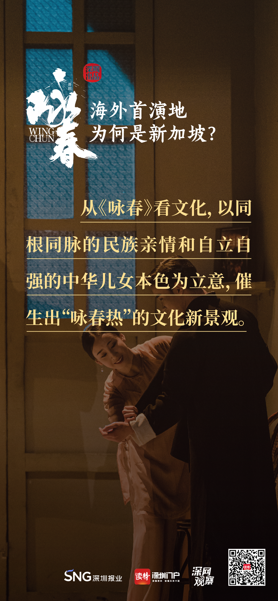 《詠春》書寫平凡英雄的傳奇,開詠春的一扇門,只為追尋心中的那一束光?!对伌骸?,連接鵬城與獅城,嶺南大地的人文史脈,輕叩著新加坡華人圈的心扉,傳統(tǒng)文化的底蘊讓兩地更加親近,海外首演,不二之選。
