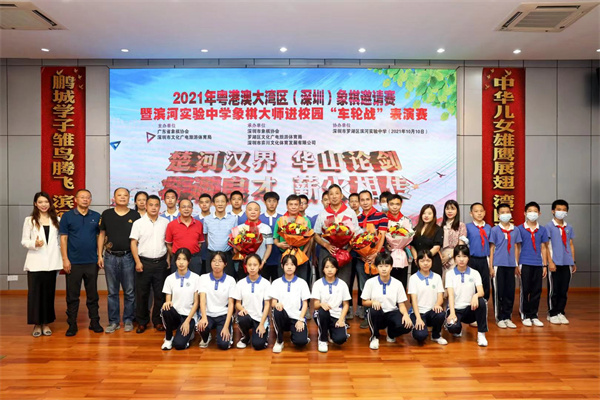 10月10日上午,羅湖濱河實驗中學內“狼煙四起”,一片激烈景象,原來,是呂欽、蔣全勝、柳大華、莊玉庭和曹巖磊5位象棋大師齊聚校園,和55名學校師生共同開展2021年粵港澳大灣區(qū)(深圳)象棋邀請賽暨濱河實驗中學象棋大師進校園“車輪戰(zhàn)”表演賽。