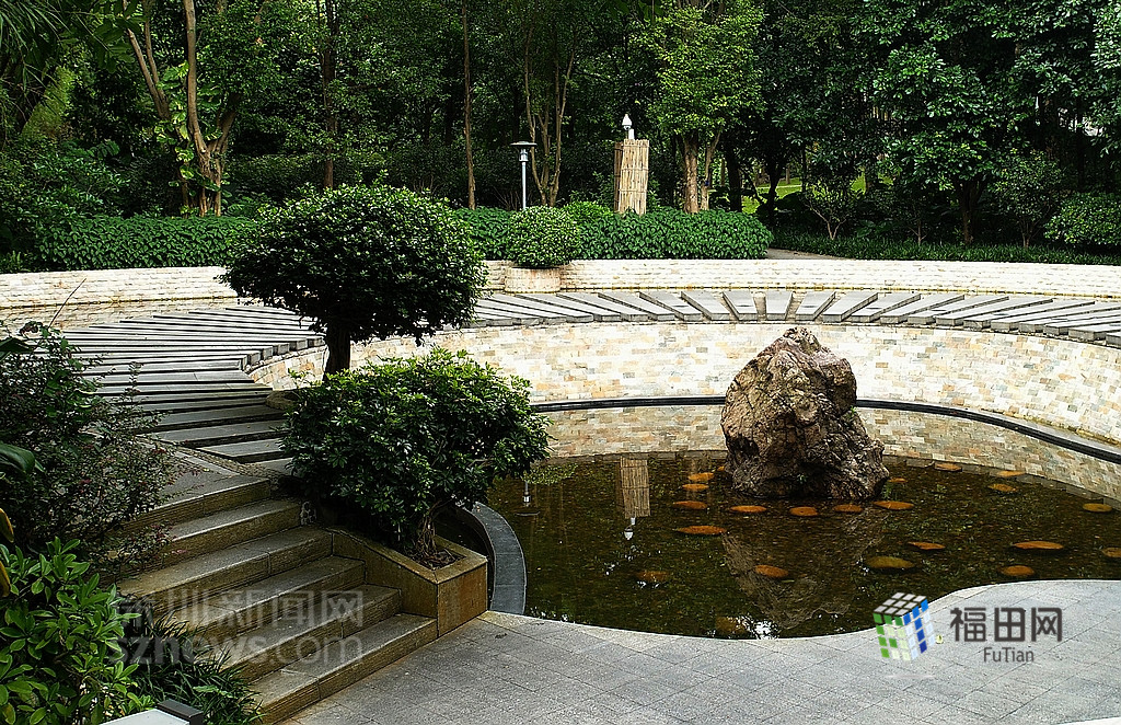 四季廣場(chǎng)旁的人工水池,池水都是從山水引下來(lái)的。