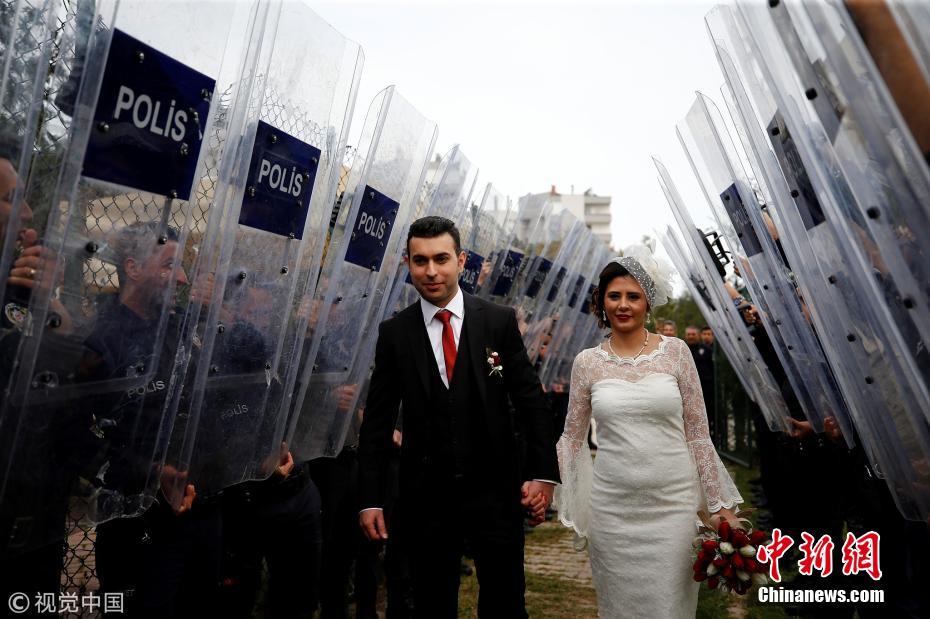 當(dāng)?shù)貢r間2018年3月21日,土耳其安塔利亞,警官Ceren Ekici和Taha YasinGul舉行婚禮。在10個月前的一次行動中,Taha YasinGul不慎開槍擊中Ceren Ekici的頭部,所幸沒有造成生命危險。他們的婚禮由警局同事操辦,同事們舉著防彈盾牌,護送這對新人走向禮臺。圖片來源:視覺中國
