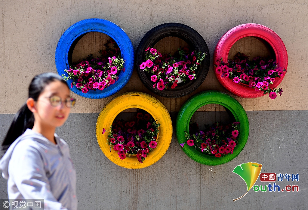 5月4日,二十余個印有卡通圖案及奧運五環(huán)造型等創(chuàng)意輪胎花盆亮相沈陽,吸引市民。