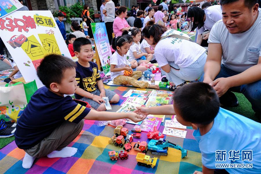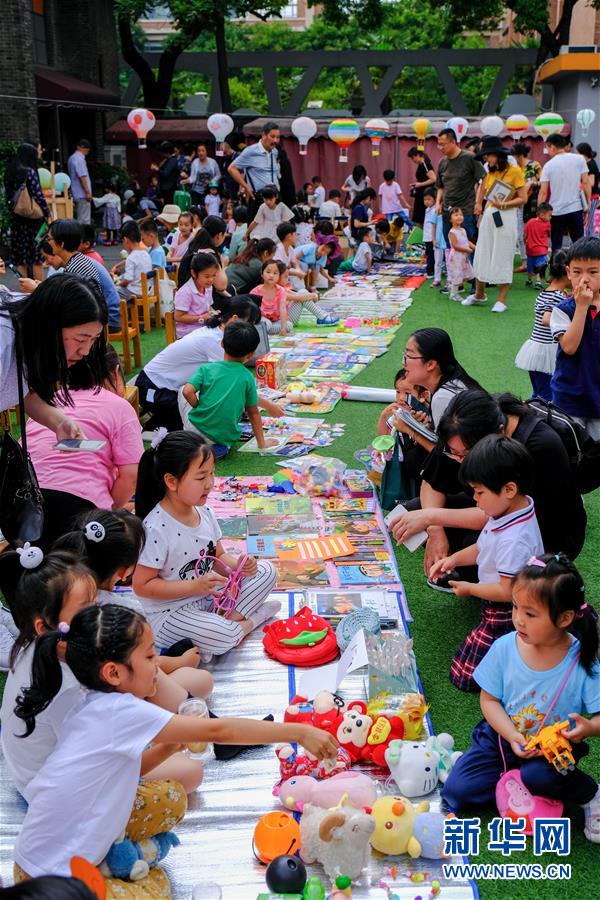 6月4日,孩子和家長們在校園“跳蚤市場”中買賣玩具和書籍。新華社記者 徐昱 攝