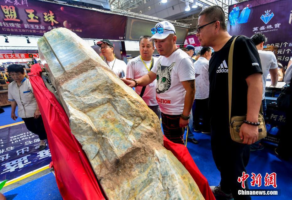 6月15日,第十一屆新疆觀賞石、和田玉精品博覽會在位于新疆烏魯木齊市紅光山的新疆國際會展中心開幕,本次博覽會參展種類涵蓋珠寶、玉石、礦石、隕石、觀賞石等,吸引眾多奇石玩家到場“以石會友”,打造獨具特色的“品石”盛宴。圖為產(chǎn)自新疆阿勒泰地區(qū)富蘊縣庫瑪拉山重量近1噸、價值1.5億元人民幣的海藍寶原礦石。中新社記者劉新 攝