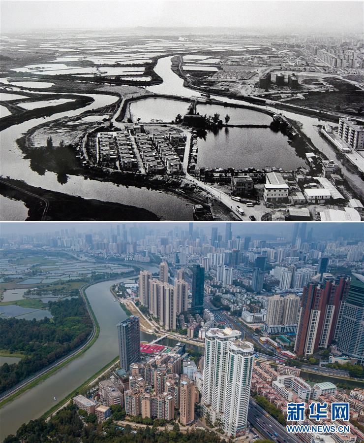 拼版照片:上圖為上世紀(jì)80年代初的深圳漁民村(資料照片,新華社發(fā));下圖為2018年3月26日無(wú)人機(jī)拍攝的漁民村(畫面前面的高樓,新華社記者毛思倩攝)。漁民村坐落于深圳河畔,從上世紀(jì)70年代水草飄零的漁船人家到改革開放以來(lái)中國(guó)第一個(gè)“萬(wàn)元戶村”,如今已經(jīng)變成加載高科技設(shè)備實(shí)現(xiàn)智能化管理的現(xiàn)代社區(qū)。新華社發(fā)