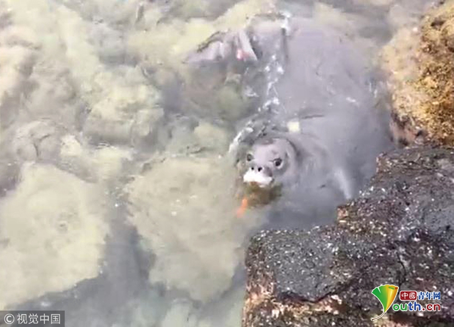 自然資源部的發(fā)言人稱它在近岸的巖石下發(fā)現(xiàn)了這個橙色小刀。一位工作人員說他很擔心小海豹會吞下刀,他還提醒我們要妥善處理垃圾,不要隨意丟棄在海灘上或者海里。