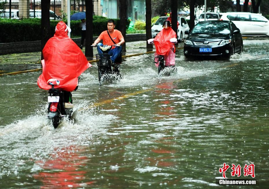 7月16日下午,河北石家莊一條馬路積水嚴重,民眾涉水騎行。當(dāng)日,該省氣象臺發(fā)布暴雨藍色預(yù)警,承德、雄安新區(qū)、廊坊北部、石家莊中西部、邢臺西部等多地遭受暴雨襲擊。中新社記者翟羽佳 攝