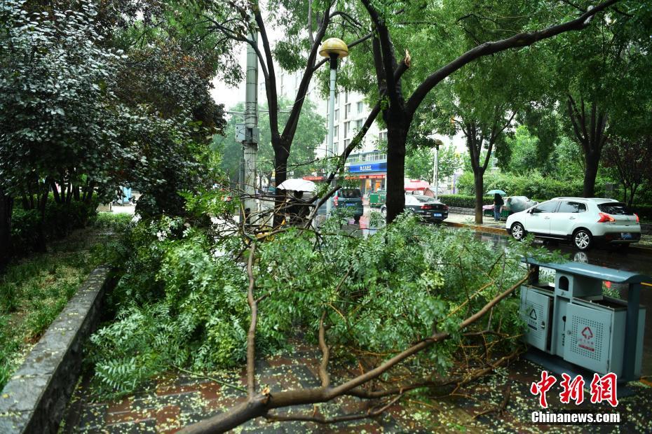 7月16日下午,河北石家莊街頭,樹枝被暴風(fēng)雨折斷。當(dāng)日,該省氣象臺發(fā)布暴雨藍色預(yù)警,承德、雄安新區(qū)、廊坊北部、石家莊中西部、邢臺西部等多地遭受暴雨襲擊。中新社記者翟羽佳 攝