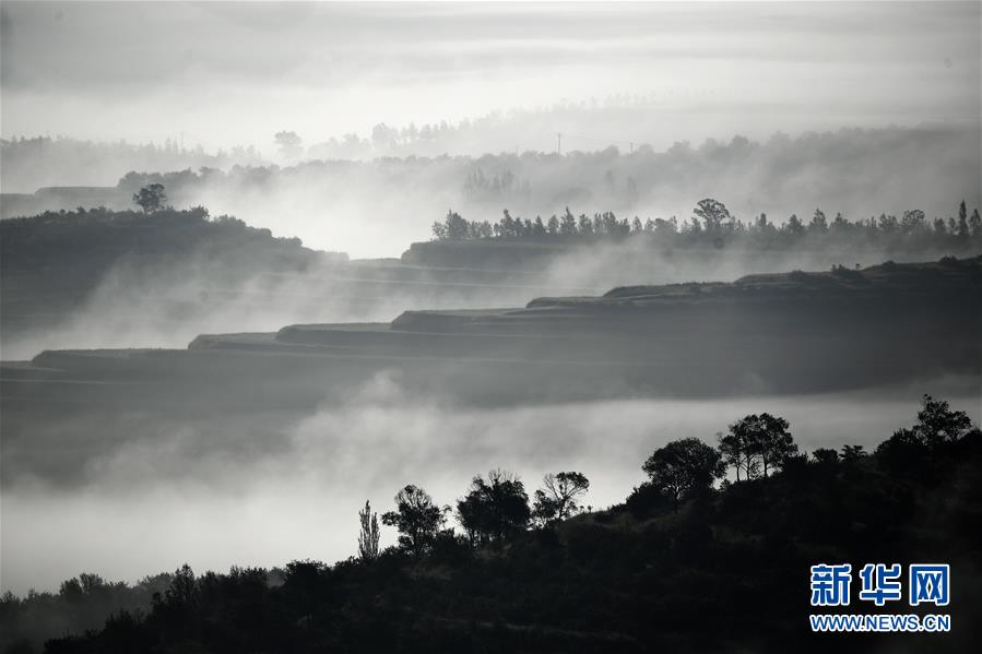 云霧繚繞的寧夏彭陽(yáng)縣金雞坪梯田公園(7月17日攝)。新華社記者 王鵬 攝