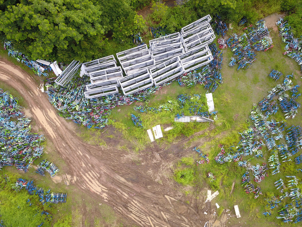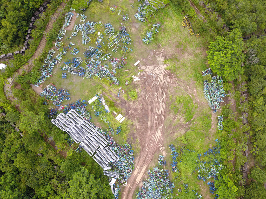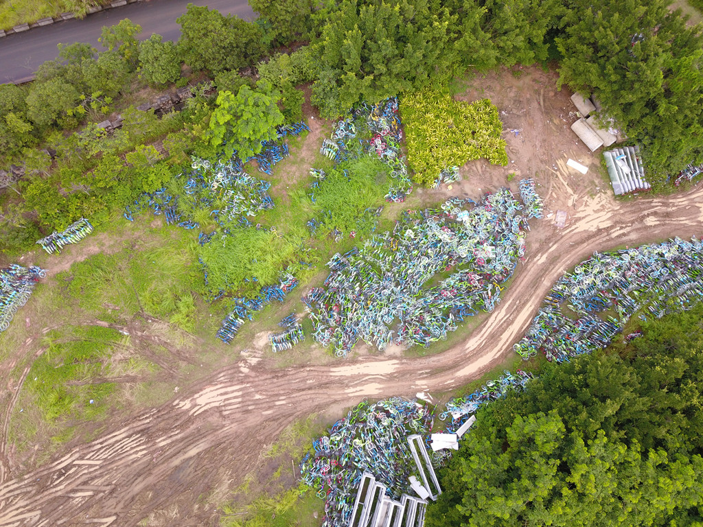 從高空俯瞰,安托山山頂?shù)墓蚕韱诬嚩逊e無序、且周圍雜草叢生,猶如一片共享單車“墳場(chǎng)”
