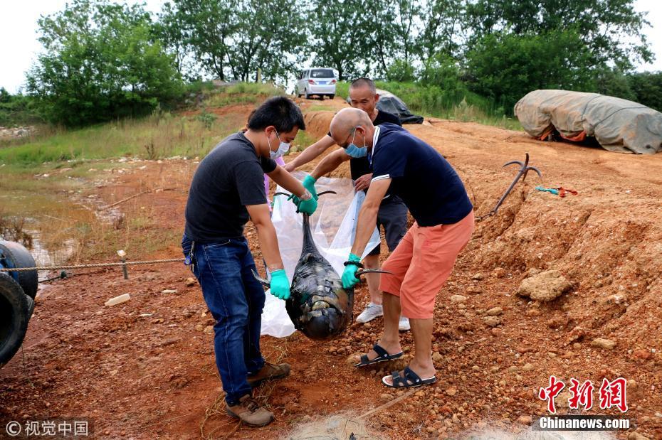 都昌護(hù)豚隊(duì)志愿者于當(dāng)日7時(shí)許將情況舉報(bào)到永修縣漁政局。11時(shí)50分左右,永修縣漁政局執(zhí)法人員到達(dá)現(xiàn)場,在查看了現(xiàn)場情況后,將死豚帶回進(jìn)行了掩埋處理。洪永林 攝 圖片來源:視覺中國 文字來源:九江新聞網(wǎng)