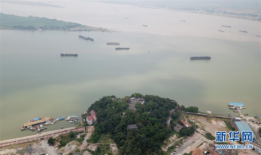長(zhǎng)江和鄱陽湖在江西省九江市湖口縣石鐘山附近交匯,形成江湖兩色美景(8月5日無人機(jī)拍攝)。 新華社記者 金立旺 攝