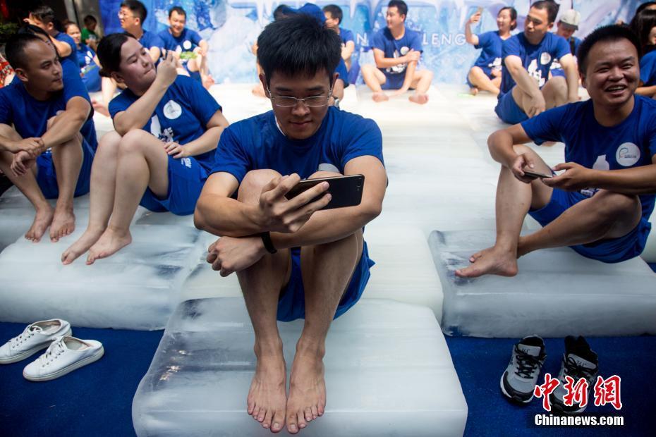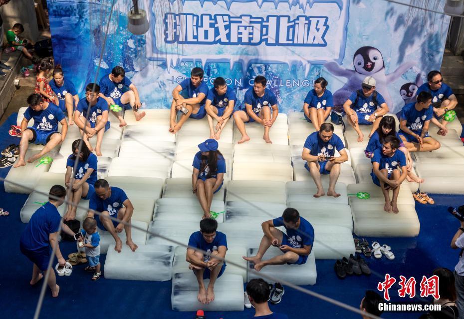 8月11日,在企鵝館舉行的決賽中,工作人員給參賽選手桶里加冰塊。當(dāng)日,一場充滿趣味性的“冰極挑戰(zhàn)賽”在武漢海昌極地海洋世界上演,參賽者們經(jīng)過“極地初體驗(yàn)”和“極寒企鵝館耐寒挑戰(zhàn)”兩個環(huán)節(jié),堅(jiān)持時間長者獲勝。中新社記者張暢 攝