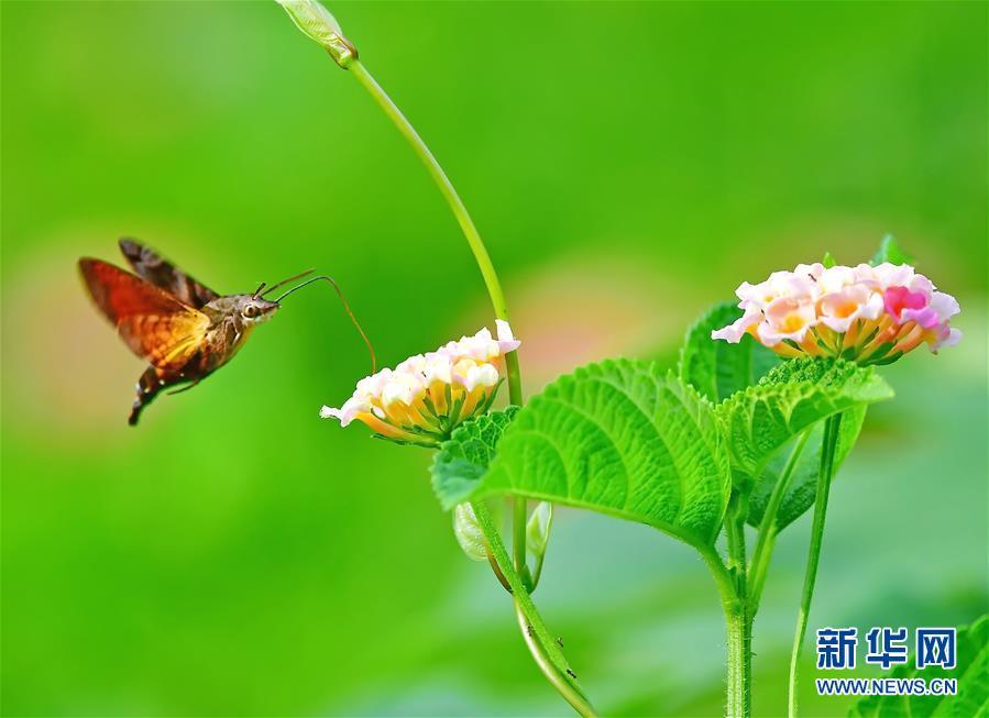 在福建省福州市溫泉公園,蜂鳥鷹蛾在花間飛舞(8月18日攝)。近日,福建省福州市溫泉公園內(nèi)的馬纓丹大面積開放?;t、草綠、蟲飛,構(gòu)成了一幅和諧的閩都生態(tài)圖景。 新華社記者梅永存攝