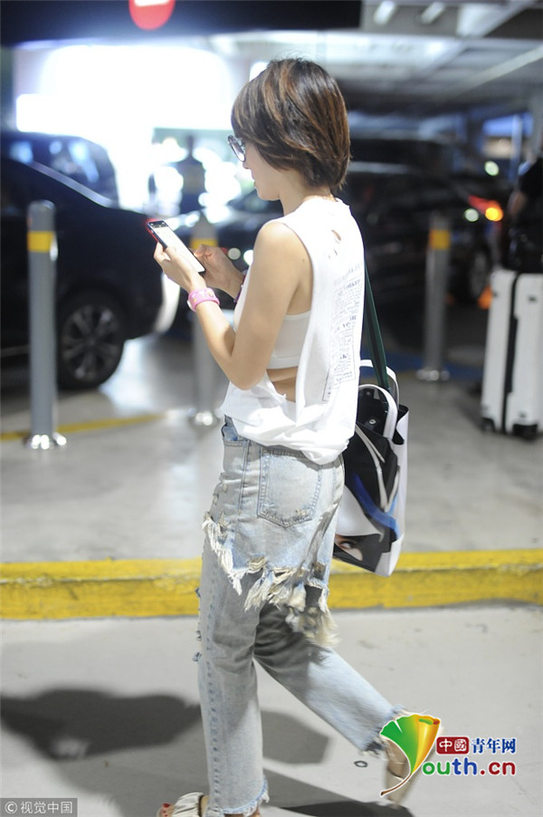 2018年8月20日,上海,馬伊琍現(xiàn)身機(jī)場(chǎng),她身穿清爽白T,小蠻腰隱現(xiàn),搭配“乞丐風(fēng)”破洞褲扮潮,一路低頭走狂刷手機(jī)。