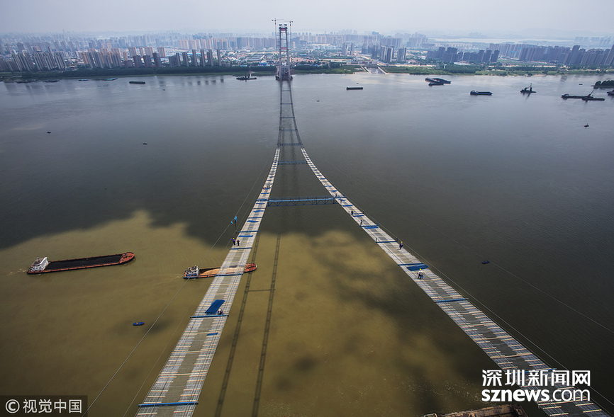 長江上空架“天梯” 武漢楊泗港長江大橋臨時“吊橋”形成