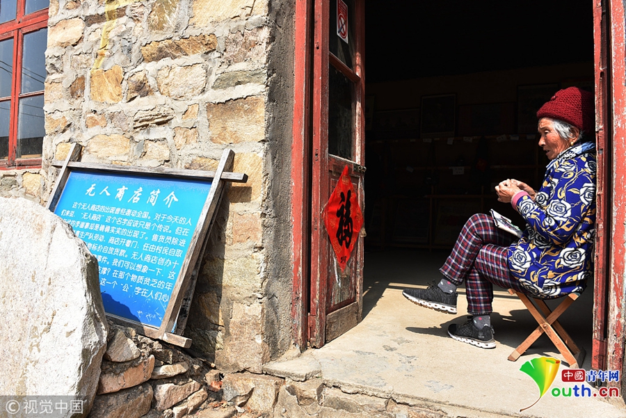 2018年3月11日,在山東省日照市五蓮縣街頭鎮(zhèn)大山深處的李崮寨村,負責管理“無人商店”的老人惠玉秀坐在商店門口納鞋墊。