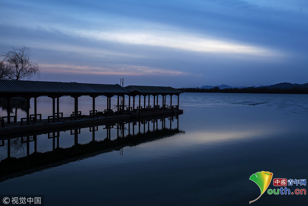 2018年2月23日,北京頤和園。當(dāng)天日落時(shí)分昆明湖上空出現(xiàn)夕陽(yáng)余暉的美景,夢(mèng)幻般的色彩將古老的皇家園林裝扮得美輪美奐,讓人流連忘返。來源:視覺中國(guó)