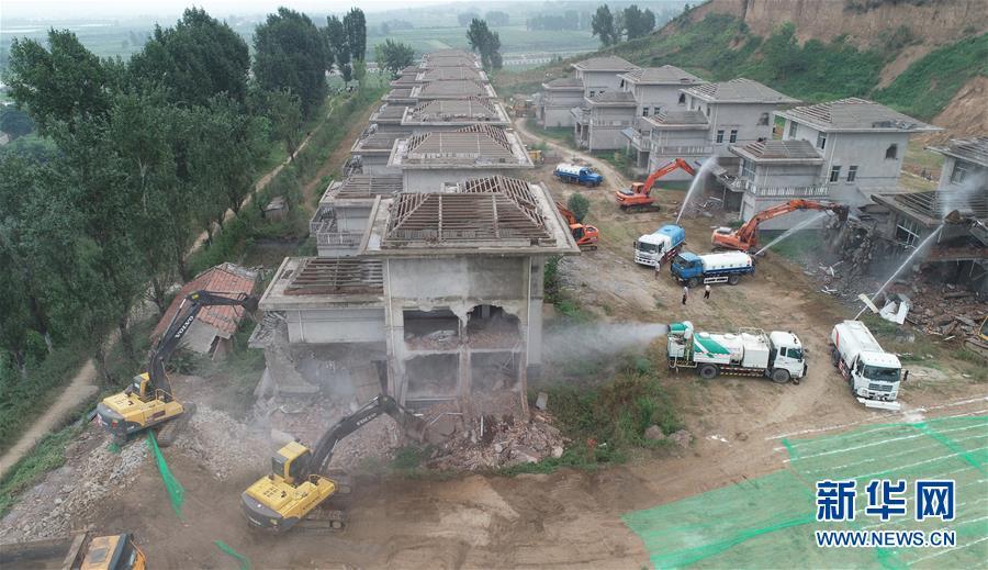 8月14日,大型機(jī)械對(duì)西安市鄠邑區(qū)蔣村鎮(zhèn)的違建別墅進(jìn)行拆除(無人機(jī)拍攝)。新華社記者 邵瑞 攝