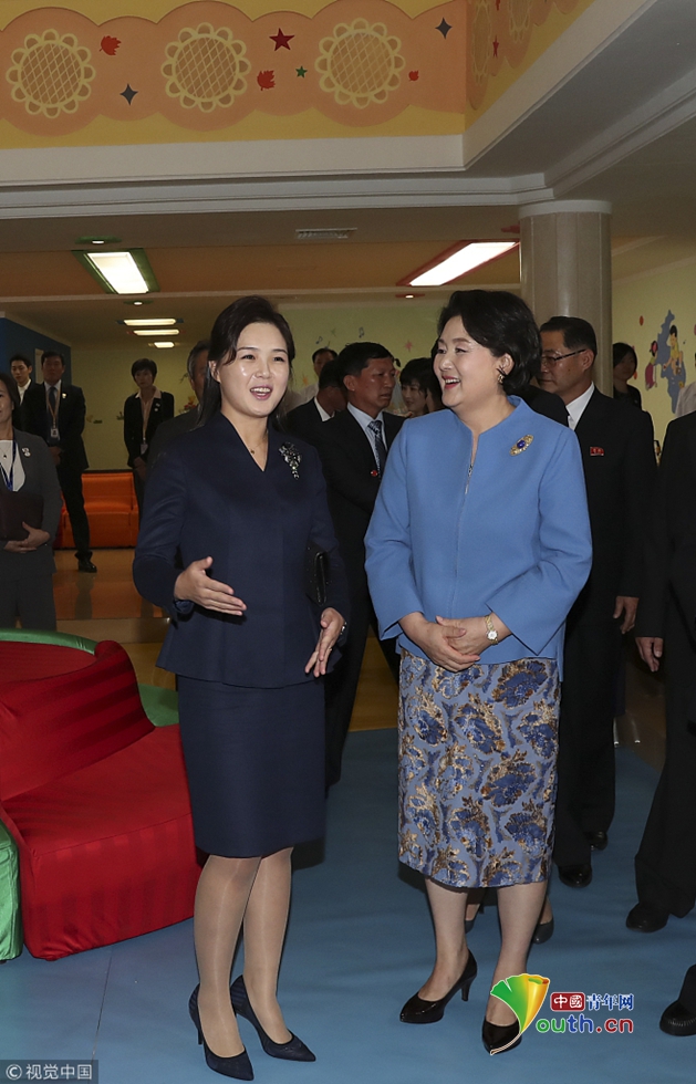 當(dāng)?shù)貢r(shí)間2018年9月18日,朝鮮平壤,韓國(guó)總統(tǒng)文在寅夫人金正淑在朝鮮國(guó)務(wù)委員會(huì)委員長(zhǎng)金正恩夫人李雪主的陪同下參觀平壤金元均音樂(lè)大學(xué)。圖片作者:視覺(jué)中國(guó)