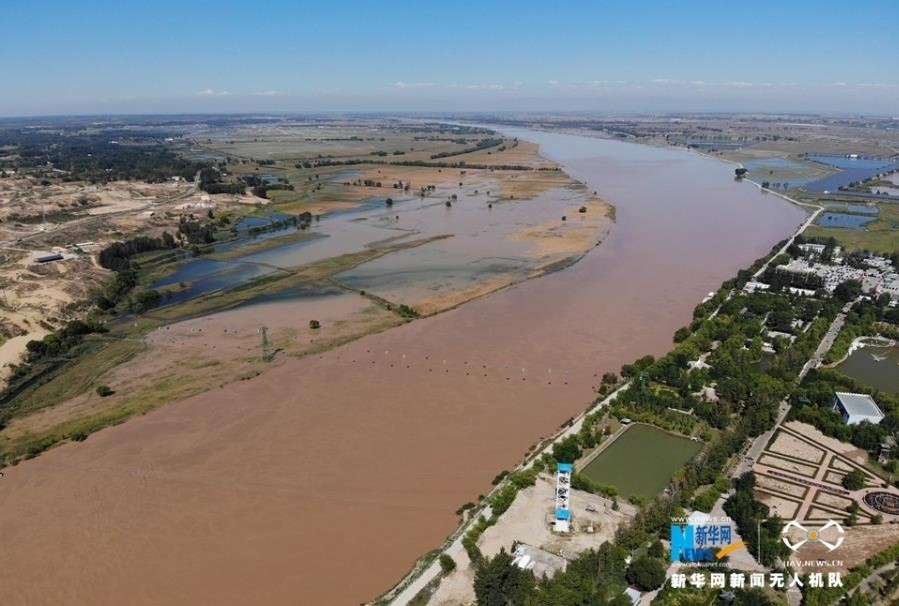 航拍黃河托克托段。黃河兩岸架起了跨黃河旅游觀光纜車(chē)。新華網(wǎng) 張偉 攝