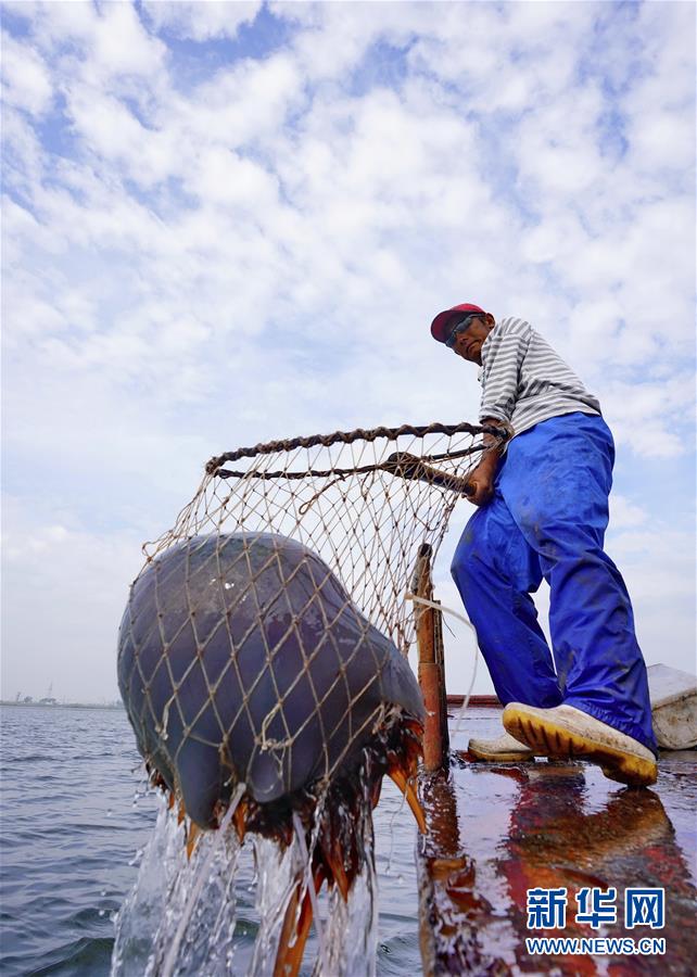 9月21日,灤南縣南堡鎮(zhèn)南堡二村一家海蜇養(yǎng)殖場的工人在養(yǎng)殖區(qū)打撈海蜇。新華社記者楊世堯攝