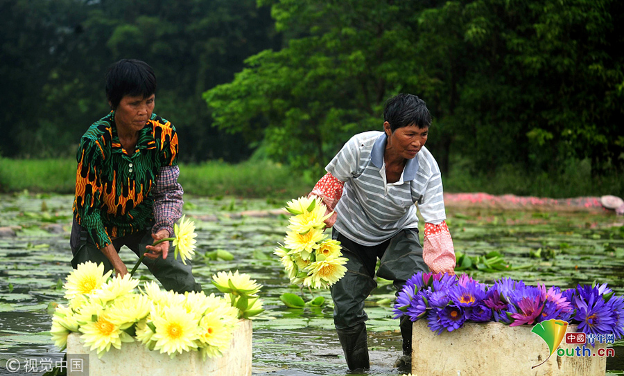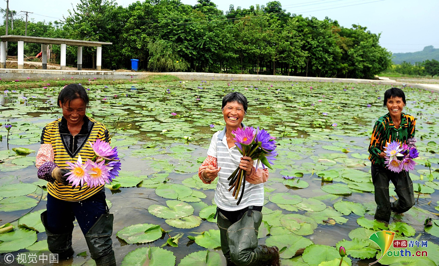 廣西柳州,柳北區(qū)石碑坪鎮(zhèn)下陶村的農民在采摘的九品香蓮。圖片作者:陳健明