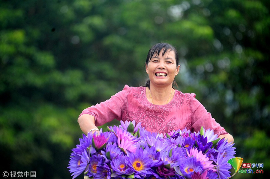 2018年9月23日,廣西柳州,柳北區(qū)石碑坪鎮(zhèn)下陶村的農民覃向鮮采摘的九品香蓮,臉上露出豐收的喜悅。圖片作者:陳健明