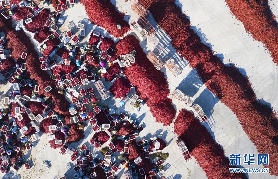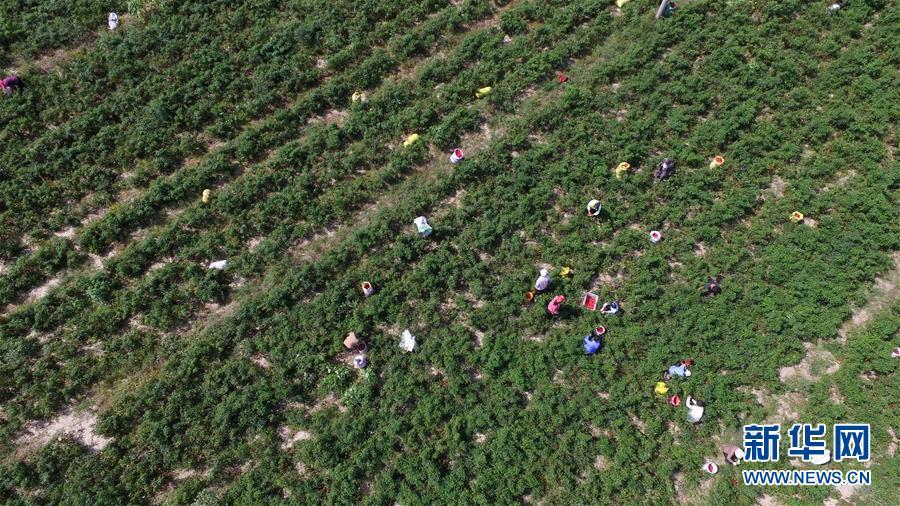 9月16日,阜城縣王集鄉(xiāng)南張莊村農民在采摘辣椒(無人機拍攝)。近年來,河北省阜城縣王集鄉(xiāng)在推進產業(yè)富民過程中,積極引導農民調整農業(yè)產業(yè)結構,按照品種特色化、種植規(guī)?;?、產銷一體化的“公司+基地+農戶”的經營模式,鼓勵農民發(fā)展特色辣椒種植,推行“訂單種植”模式,開辟出了一條農民創(chuàng)收新路徑。目前,阜城縣王集鄉(xiāng)辣椒種植面積3100余畝,每畝年收益2500元以上,帶動當?shù)剞r民實現(xiàn)增收。新華社記者朱旭東攝