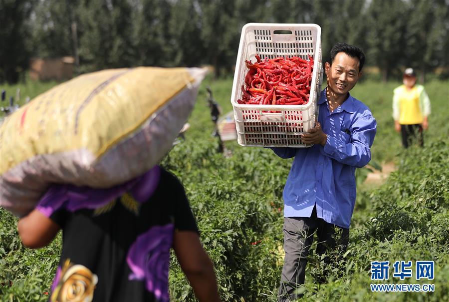 9月16日,阜城縣王集鄉(xiāng)南張莊村農民在搬運采摘的辣椒。近年來,河北省阜城縣王集鄉(xiāng)在推進產業(yè)富民過程中,積極引導農民調整農業(yè)產業(yè)結構,按照品種特色化、種植規(guī)?;a銷一體化的“公司+基地+農戶”的經營模式,鼓勵農民發(fā)展特色辣椒種植,推行“訂單種植”模式,開辟出了一條農民創(chuàng)收新路徑。目前,阜城縣王集鄉(xiāng)辣椒種植面積3100余畝,每畝年收益2500元以上,帶動當?shù)剞r民實現(xiàn)增收。新華社記者朱旭東攝